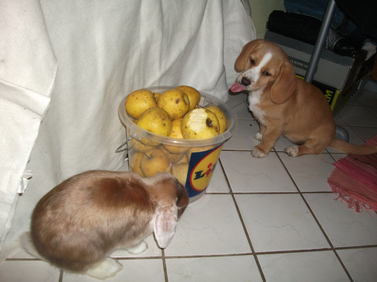 2013.02.16 21:03A ketrece az asztalon volt, a kutyus (Bogyó) az ölünkbe ugorva izgatottan nézte az új jövevényt. Be kellett érnie a ketrecen keresztüli szimatolással. Elkerítettünk egy kisebb részt a nappaliban, ide engedtük ki először. Kíváncsian nézett körbe mindent megszimatolva, hamarosan láthattuk milyen is a kergenyuszizás. Bogyót is behoztuk rövidebb időkre, Spuri zavartalanul rohangált tovább. Pár alkalom után már közelebb is kerültek egymáshz, akkor készülek az első közös képeik. A bökdösésre,nyalogatásra Spuri nem hogy odébb állt volna, hagyta a piszkálást és még el is aludt közben. Bogyó hamar leszokott róla hogy a nyuszi után akarjon rohangálni, csak akkor maradhatott az elkerített részen ha nyugodtan viselkedett.